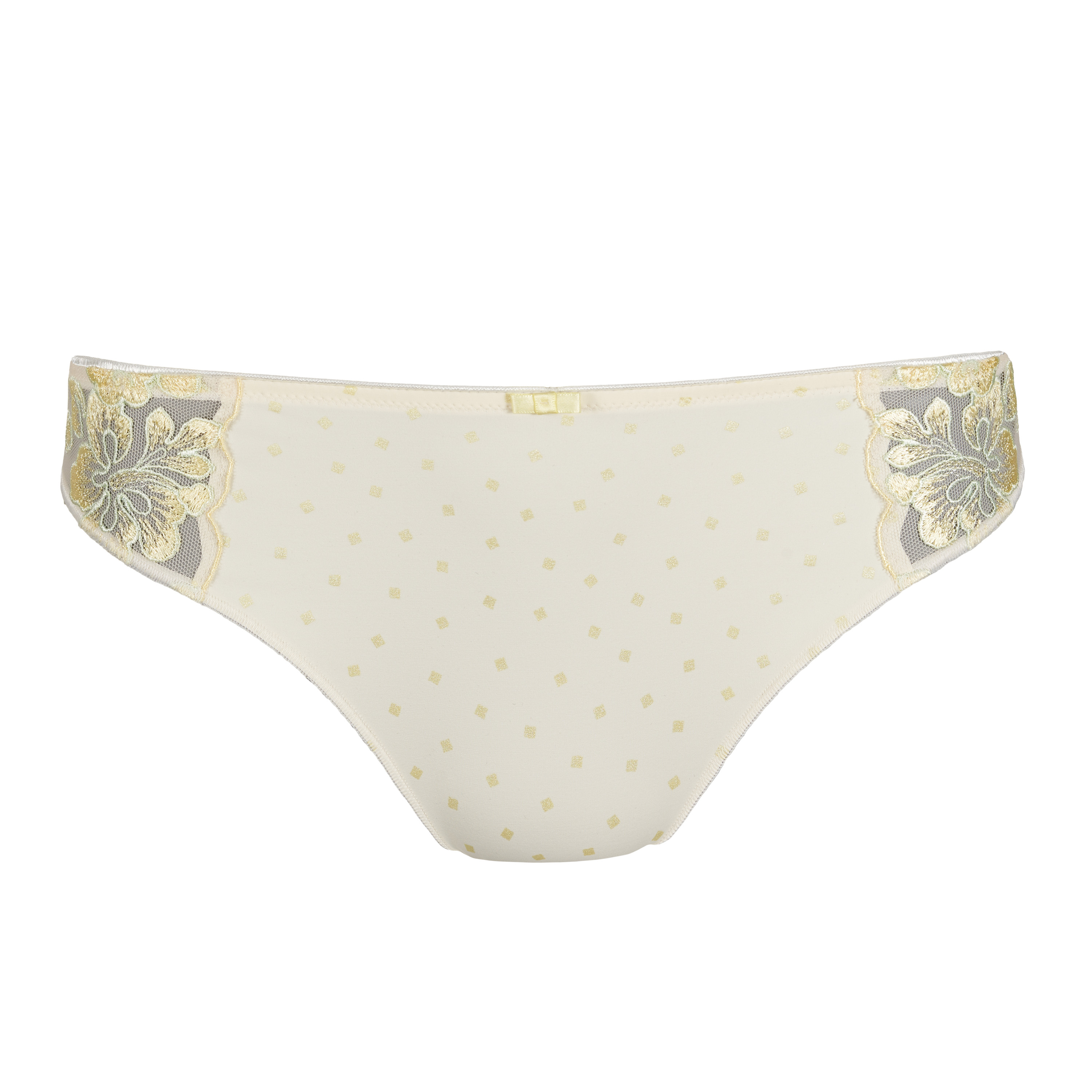 - String aus der Serie Prima - florale Tüllstickerei im zarten Gelb-Grün-Ton - farblich abgestimmter Satinschleife
